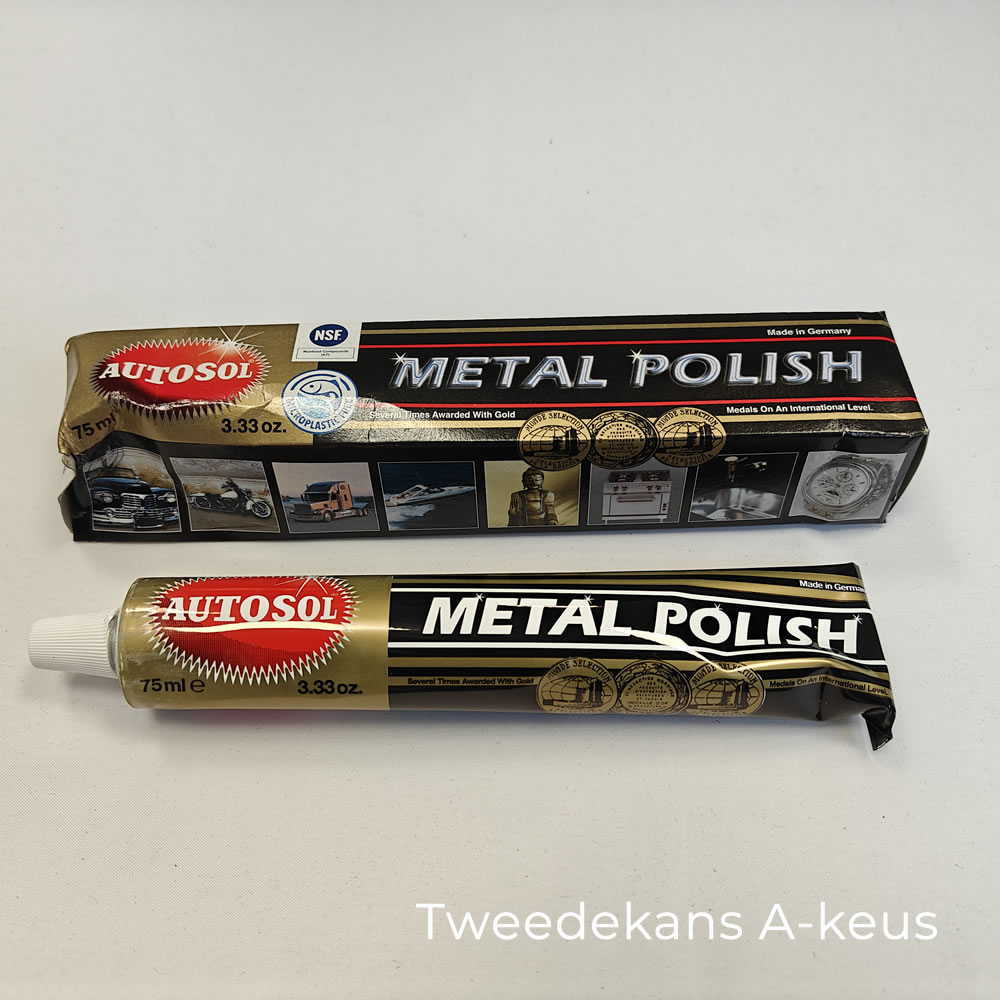 With the Autosol Metal Polish, polishing paste with abrasive you will get virtually all metals (including stainless steel) shiny again. This metal polish is a powerful polishing agent and therefore very suitable for brushing metal. It removes rust and deposits (also brine deposits), gives a beautiful shine and leaves a protective layer behind.